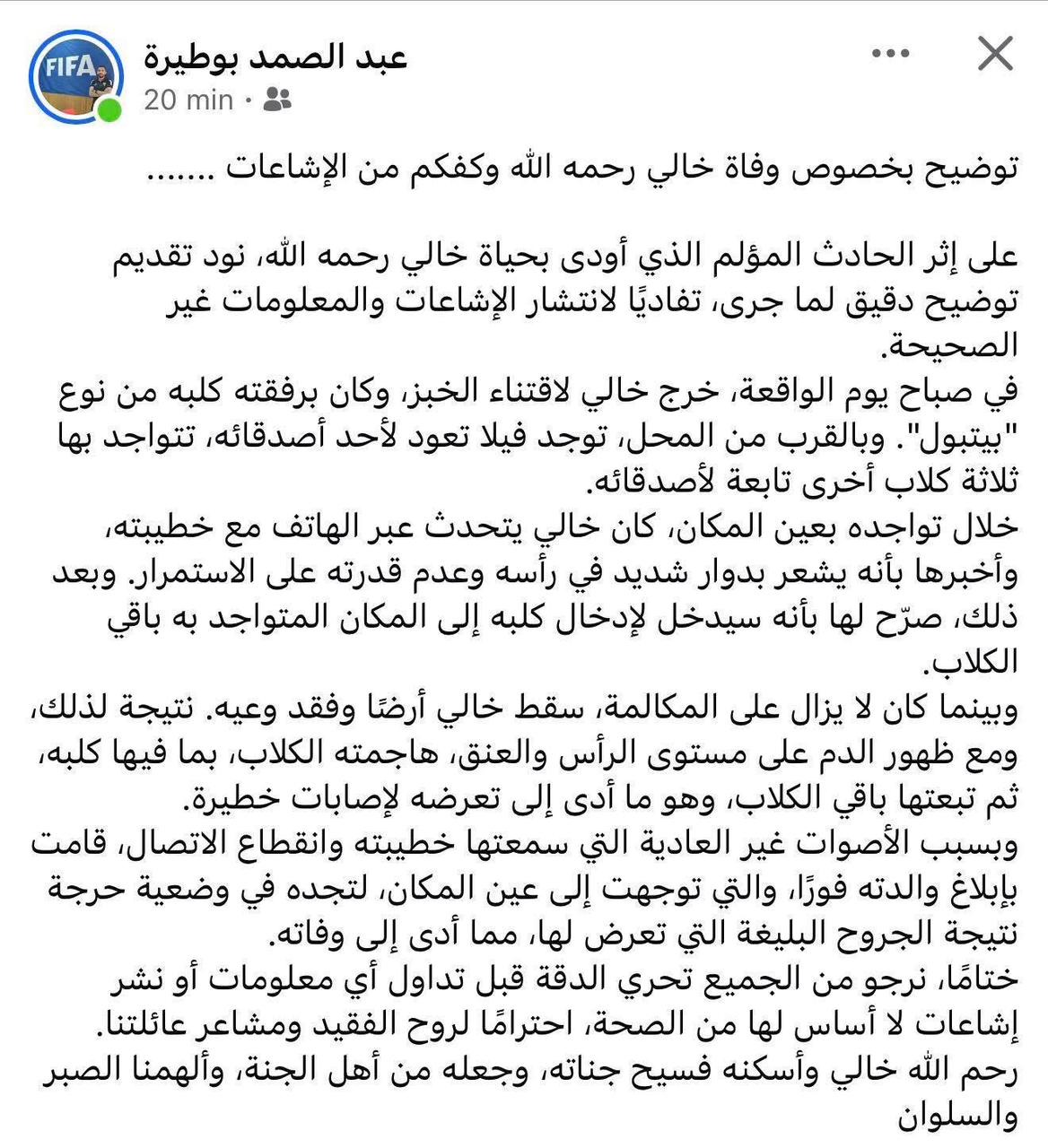 وفي هذا السياق، خرج أحد أقرباء الضحية بتوضيح رسمي، أكد فيه أن الفقيد غادر منزله صباح يوم الحادث لاقتناء بعض الحاجيات، وكان برفقته كلبه. وبالقرب من المكان، تواجدت مجموعة من الكلاب الأخرى داخل محيط منزل يعود لأحد أصدقائه.